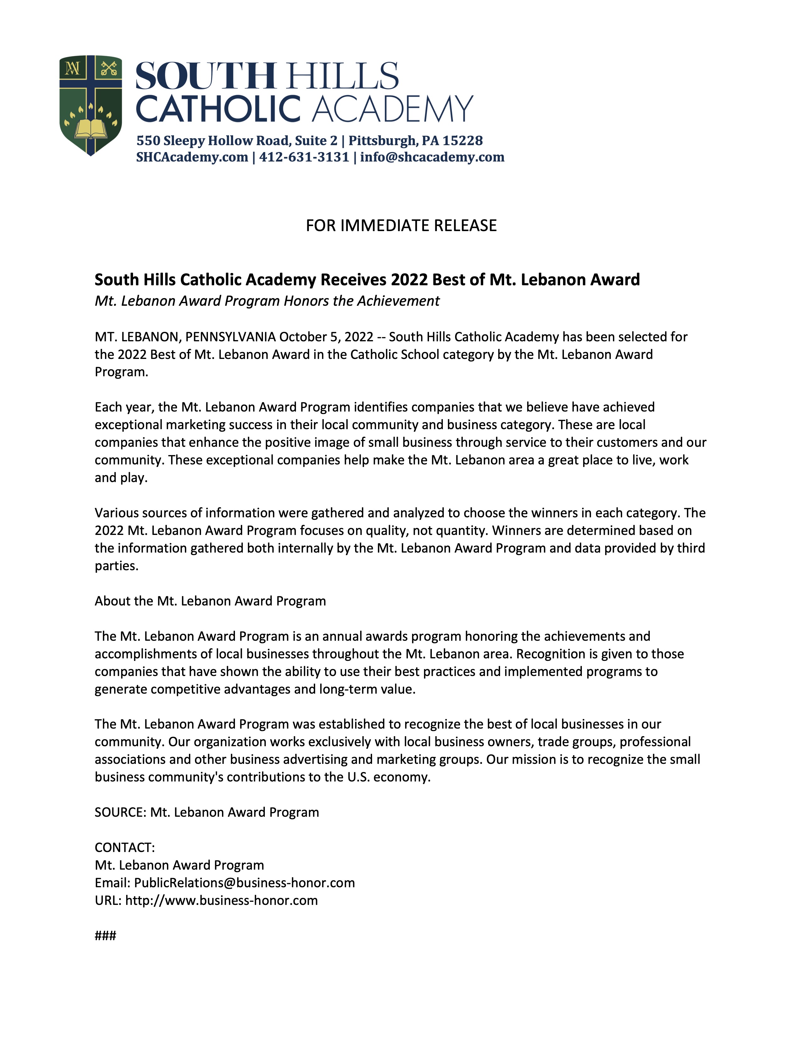 . South Hills Catholic Academy. The mission of the South Hills Catholic Academy SHCA is to assist parents in the Christian spiritual moral and intellectual formation. The school is easily accessible to Route 88 and neighboring communities in the South Hills of Pittsburgh.